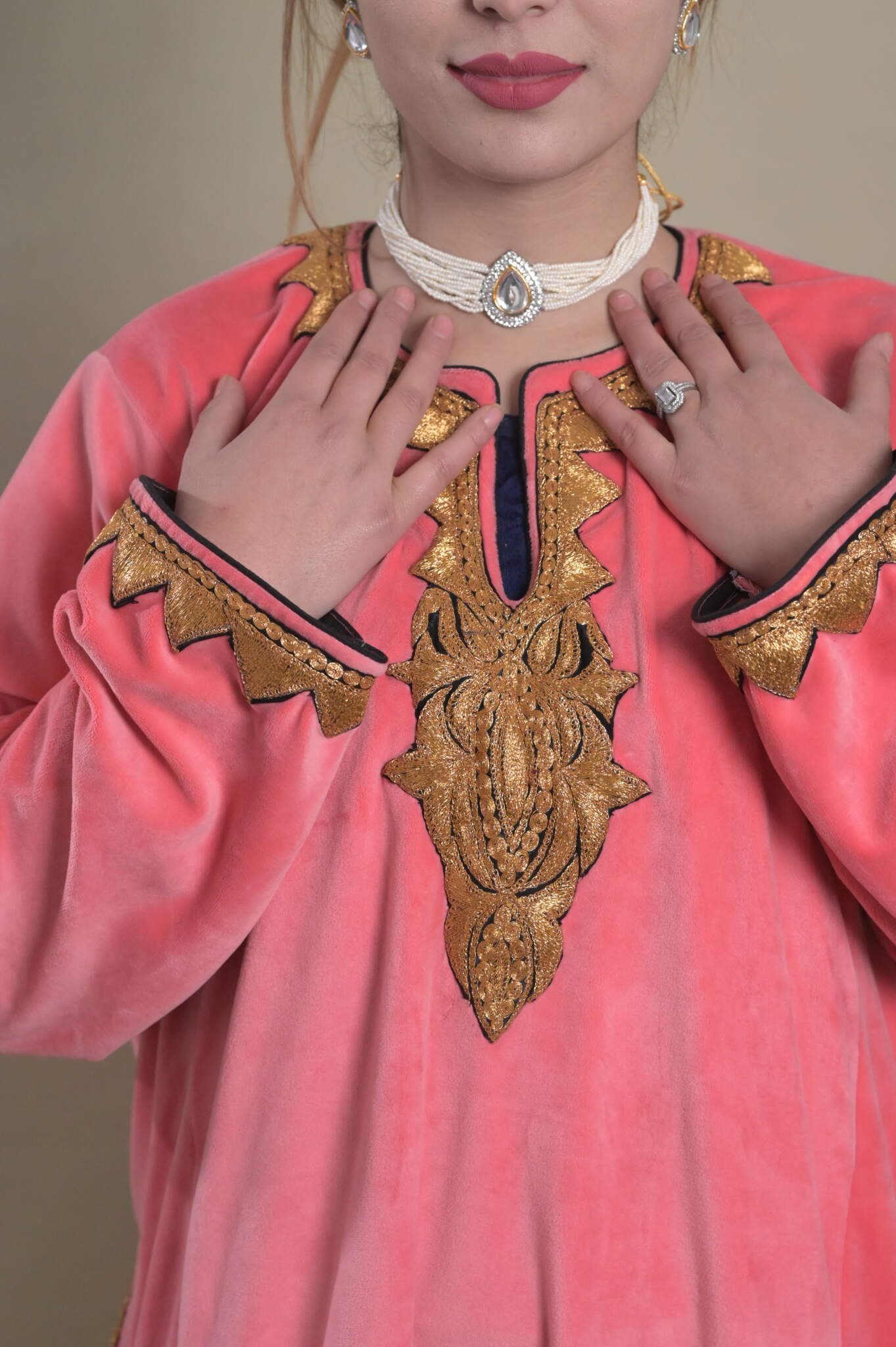 Handcrafted cotton velvet pheran with fine machine tilla (peach) with refined detailing. Perfect for everyday elegance and timeless style.