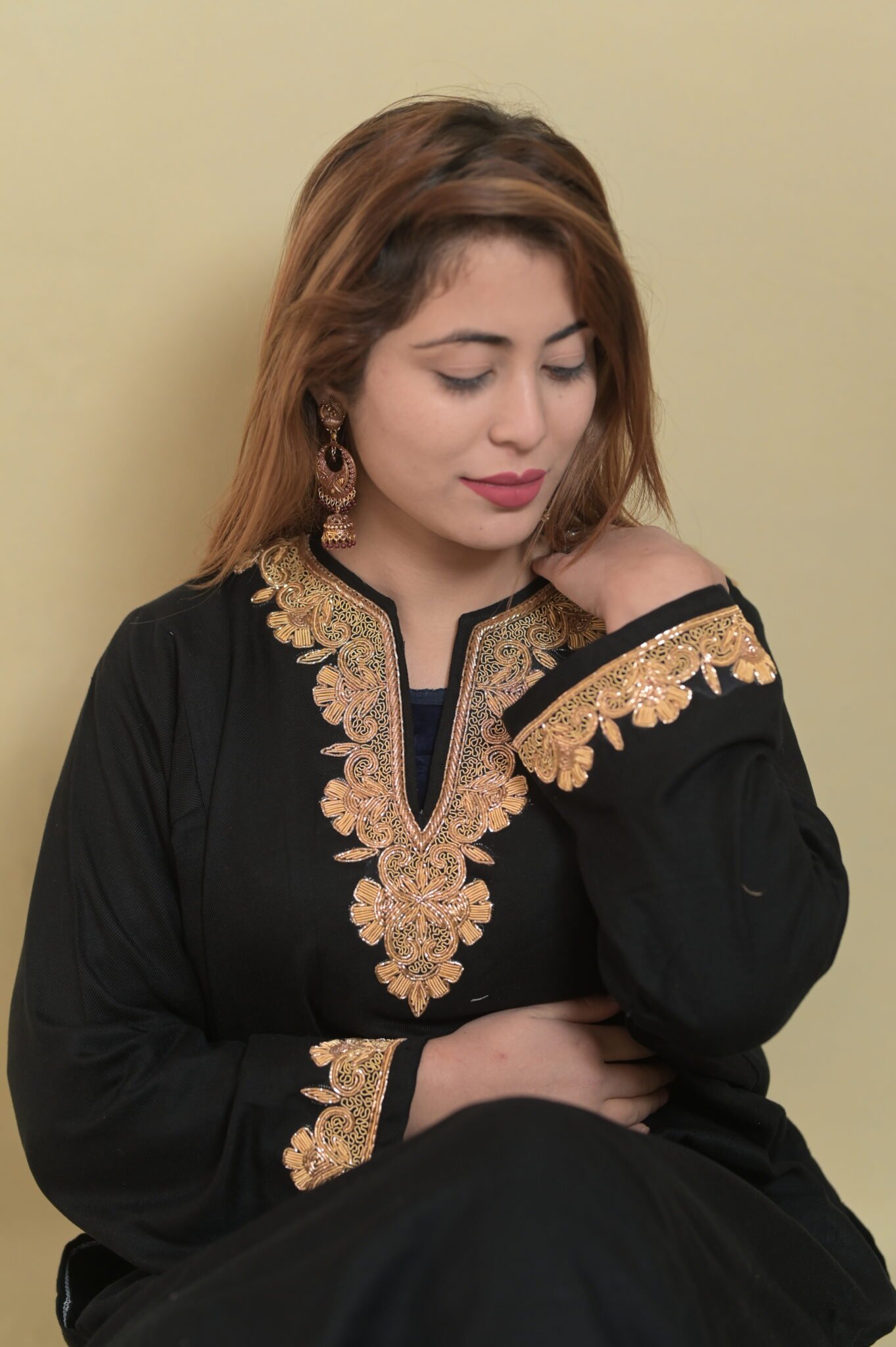 Handcrafted dabka embroidered pheran co ord set with refined detailing. Perfect for everyday elegance and timeless style.