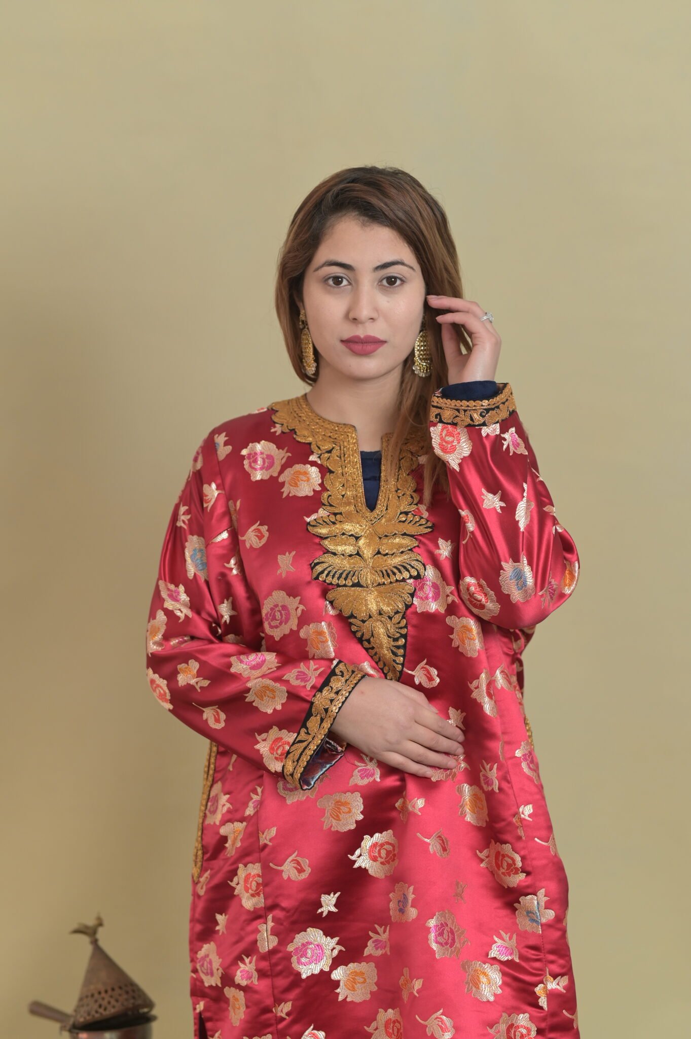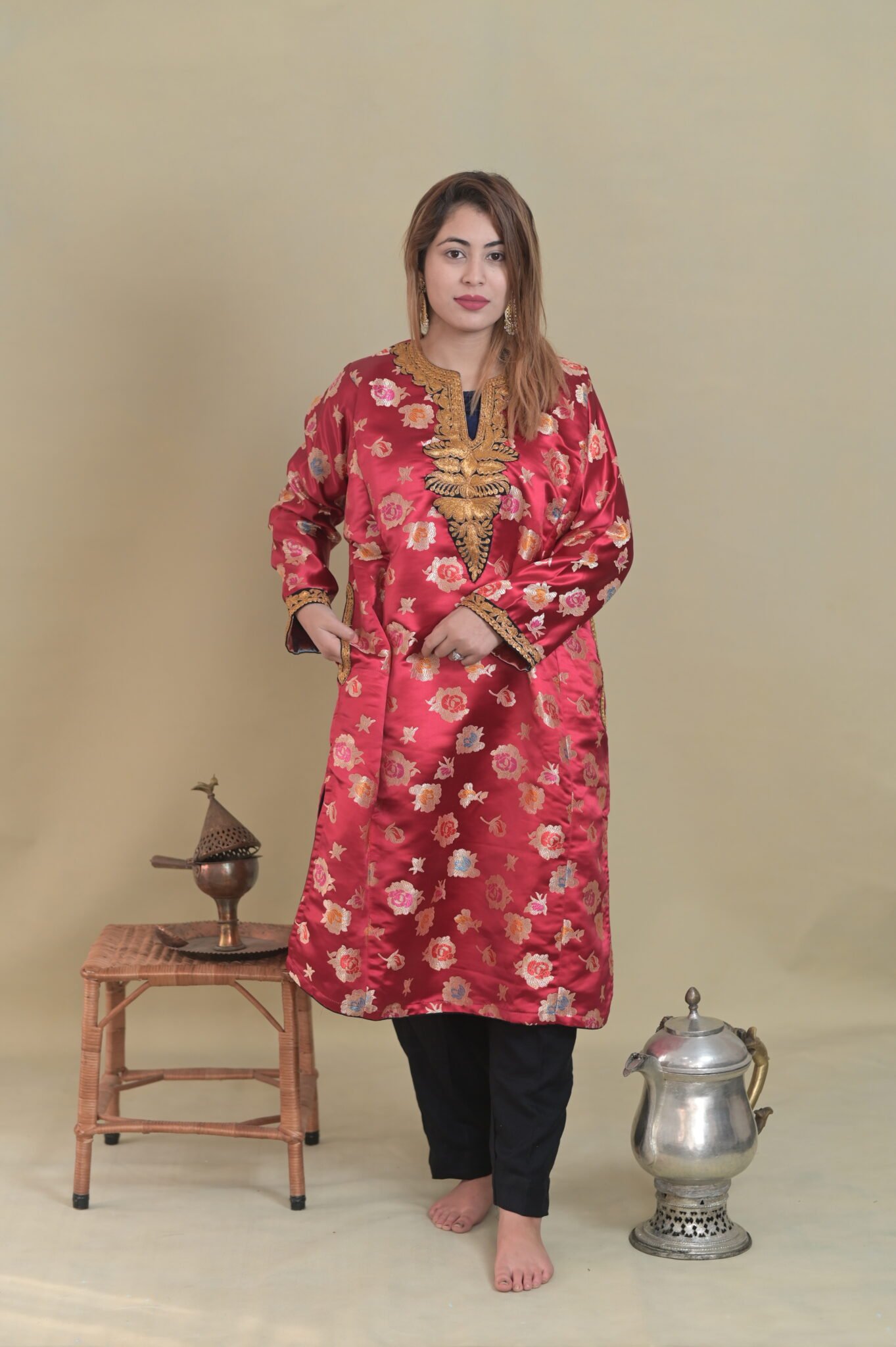 Experience the beauty of true craftsmanship with this handcrafted imported brocade pheran with fine machine tilla work. Each piece is thoughtfully created to reflect quality, authenticity, and timeless appeal. Designed for those who appreciate fine artistry, it blends tradition with modern elegance. Ideal for personal use or as a meaningful gift, this product embodies premium workmanship and enduring style.
